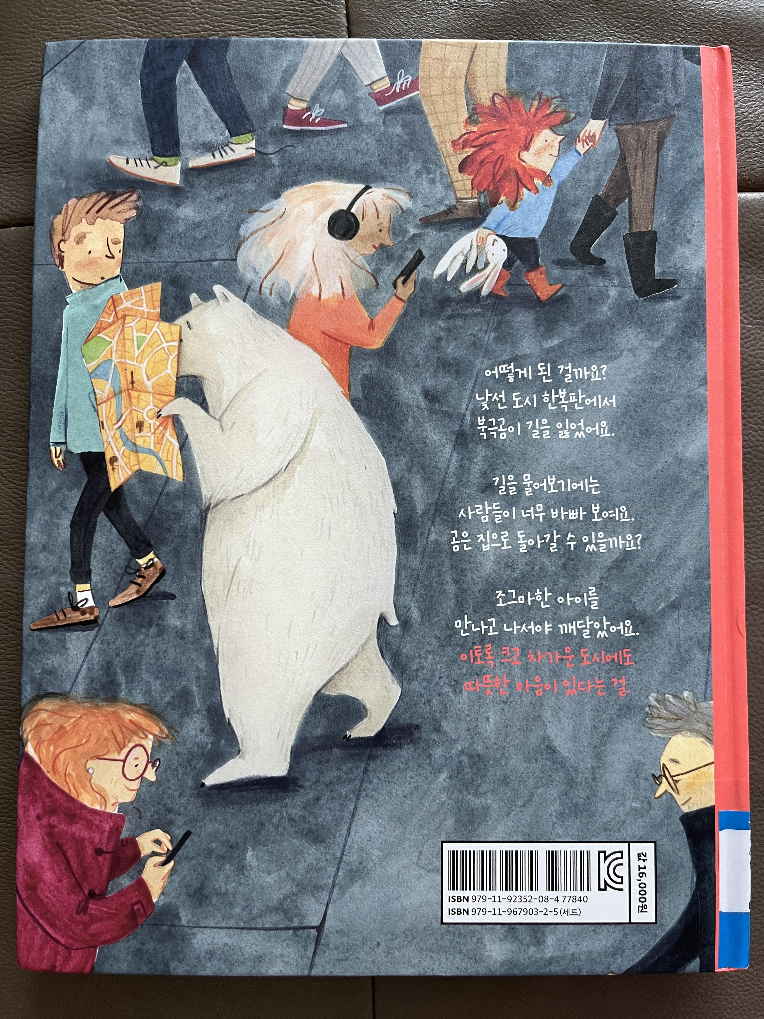 도서관에서 아이를 위해 빌릴 책을 찾다가, 표지에 지도가 있는 것을 보고 선택한 책! 지도보기를 재미있어하는 아이라서 분명 좋아할 것이라고 생각했다. 내용은, 길을 잃은 북극곰이 한 아이를 만나서 도움을 받아 집으로 돌아가게 되는 이야기이다. 글밥은 많지 않고, 문장도 짧게 짧게 되어 있다. 각 페이지를 찬찬히 읽고 그림을 들여다보면서 아이와 대화하면서 읽기 좋은 책이다. 곰이 북극으로 돌아갈 수 있도록 책 속 아이가 고안한 방법도 재미난데, 우리 아이는 어떤 방법을 만들어낼 수 있는지 물어보면 좋을 듯!